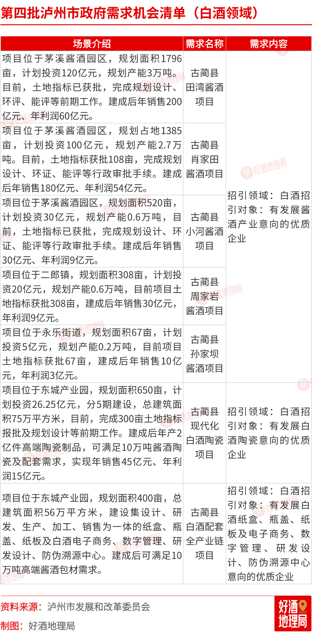 近日,泸州市发展和改革委员会发布第四批城市机会清单,其中包括古蔺县7个白酒领域招引项目,具体如下图。(泸州市发展和改革委员会)