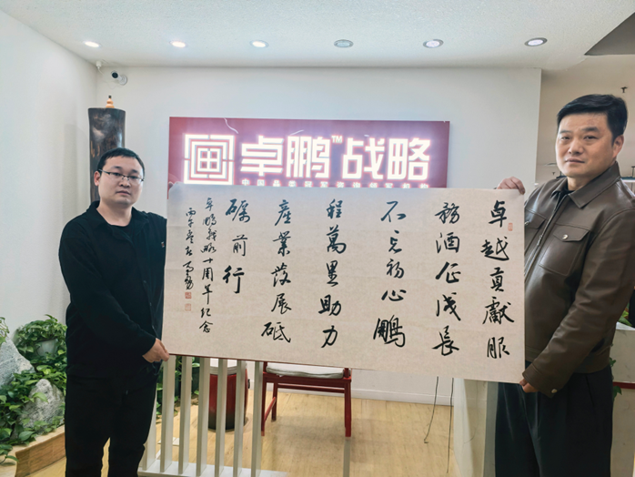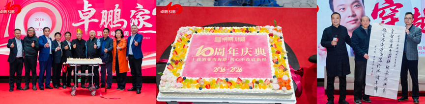 晚宴现场还举行了温馨的卓鹏战略十周年庆切蛋糕仪式,特别邀请嘉宾代表共同上台,携手切下十周年纪念蛋糕,一同见证卓鹏战略十年深耕酒业的辉煌历程;中国著名酿酒大师赖登燡赖老(现场),中国食品工业协会副会长兼秘书长马勇,更是为卓鹏战略送上墨宝,共同祝愿卓鹏战略未来行稳致远、再谱新篇,也祝愿中国酒业在穿越产业周期中持续进化,在窄门之路上寻得发展新机,迈向更高质量发展的新阶段。