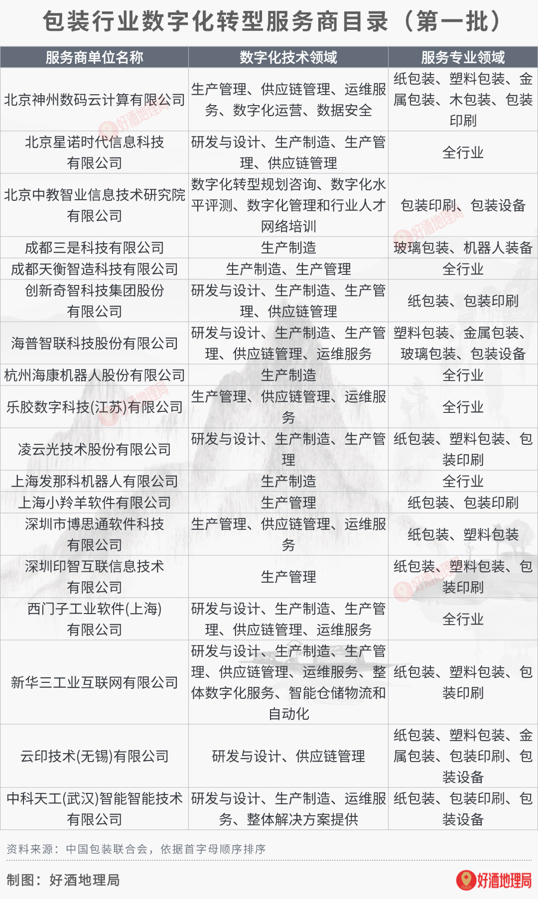 4月7日,中国包装联合会发布关于发布包装行业数字化转型服务商目录(第一批)的通知,共18个服务商入选,具体如下图。(中国包装联合会)