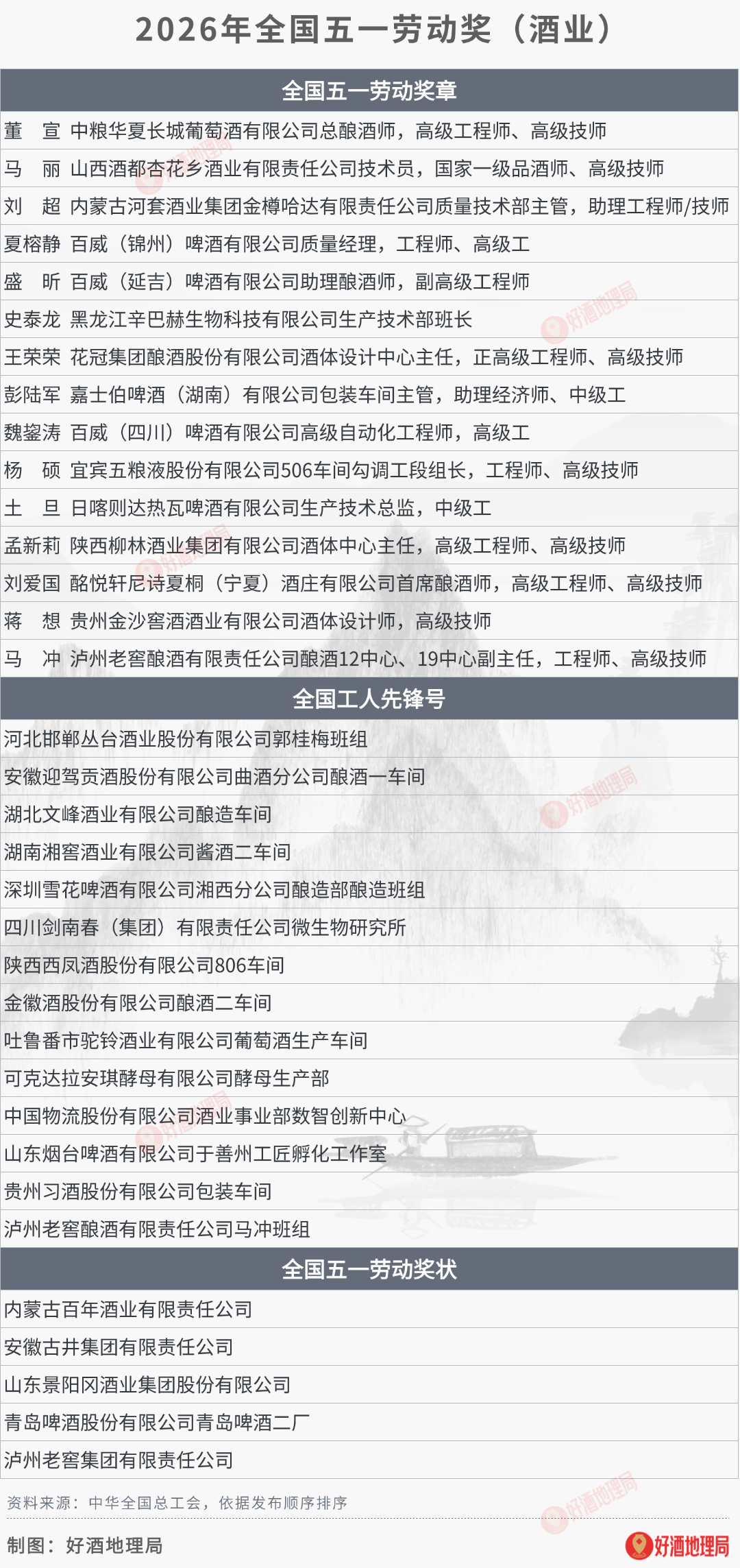 4月9日,中华全国总工会公示了2026年全国五一劳动奖拟表彰对象,酒业有5家企业拟获全国五一劳动奖状,15名职工拟获全国五一劳动奖章,14个集体拟获全国工人先锋号荣誉。具体如下图。(中华全国总工会)