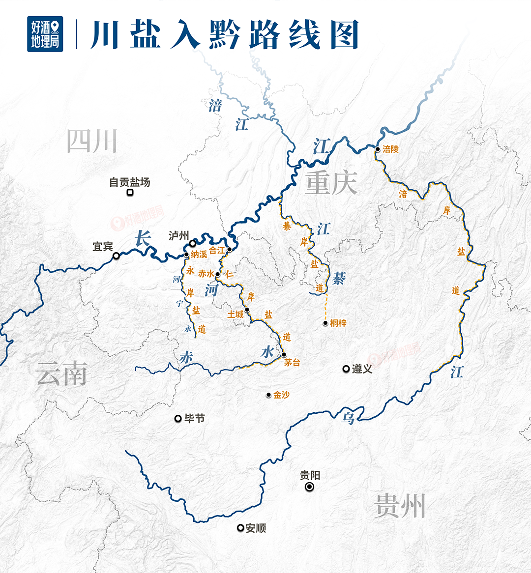 ▎得天独厚的地理条件,使泸州成为连接古蜀道与黄金水道的重要节点。川盐入黔有四大口岸,其中两个就在泸州。制图@好酒地理局