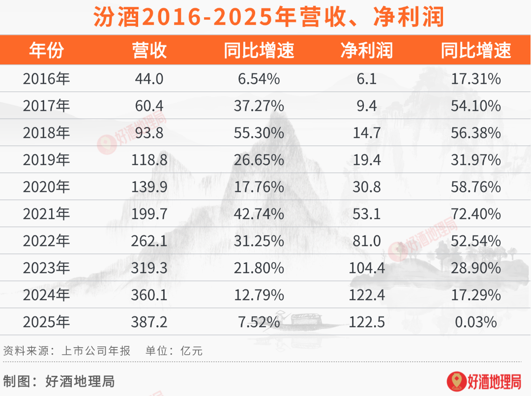 2022年营收突破262亿元,2023年站上319亿元,2024年跨越360亿元,2025年达到387亿元。营收增速从2022年的31.25%逐回落至2025年的7.52%,这是汾酒主动降速、换挡提质的战略选择。