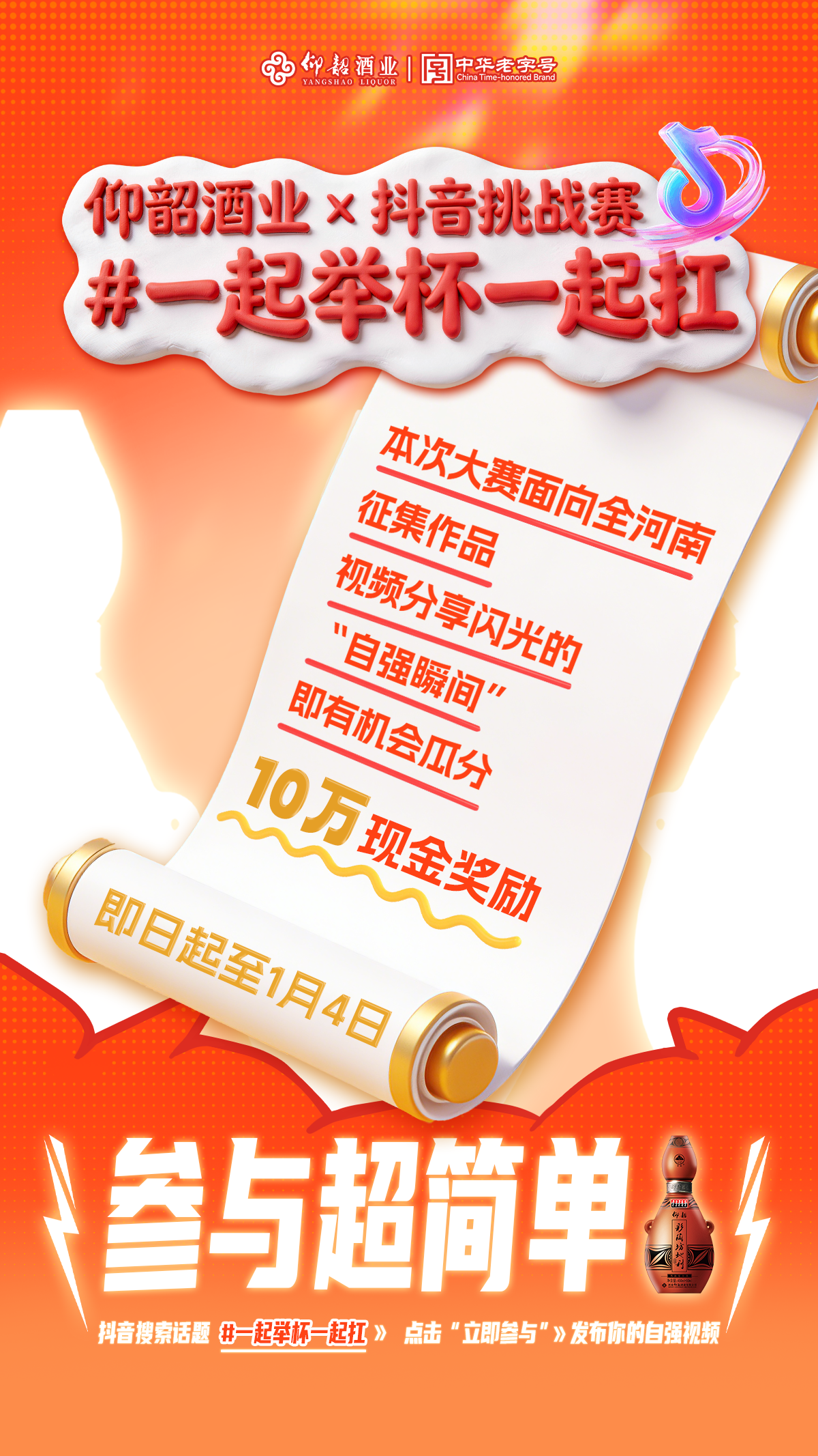 12月26日,仰韶酒业发起的#一起举杯一起扛 抖音短视频大赛正式上线。活动凭借鲜明的情感主张与诚意满满的奖励机制,迅速吸引众多网友关注!本次活动将持续至2026年1月4日24时,为期10天的创作窗口期内,参与者可通过短视频记录职场拼搏、梦想追逐或温暖守护的瞬间,传递自强态度,并有机会赢得相应现金奖励,让每一份真诚表达获得实质认可。