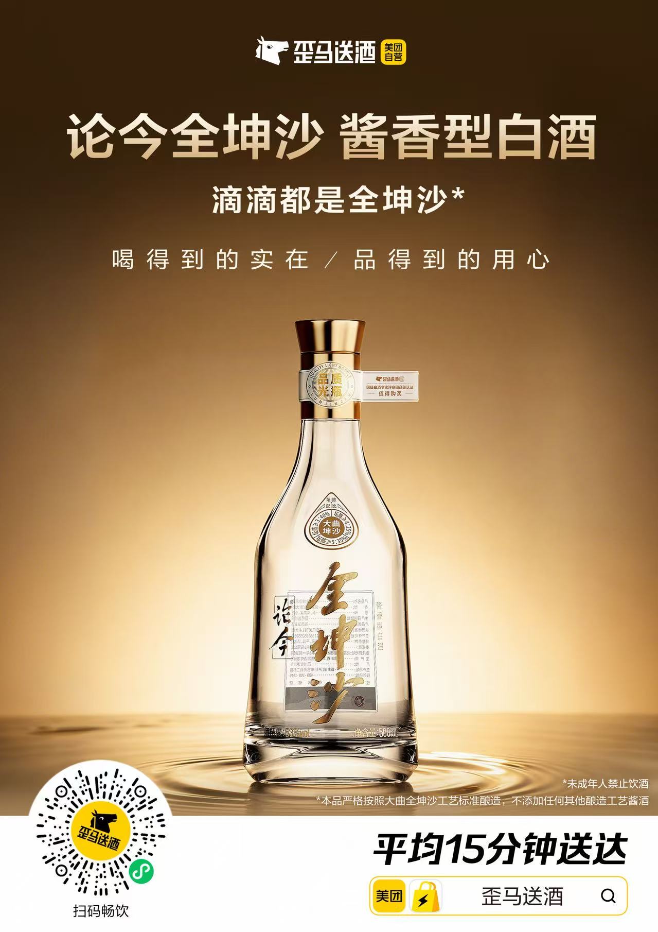 歪马送酒的即时零售渠道与川酒集团的品质积淀相结合,不仅重塑了百元酱酒的品质基准,也打开了白酒即时零售的品质化通路。“论今·全坤沙”全面上线,既回应了消费者对高质价比酱酒的旺盛需求,也为白酒行业的创新发展提供了新思路。