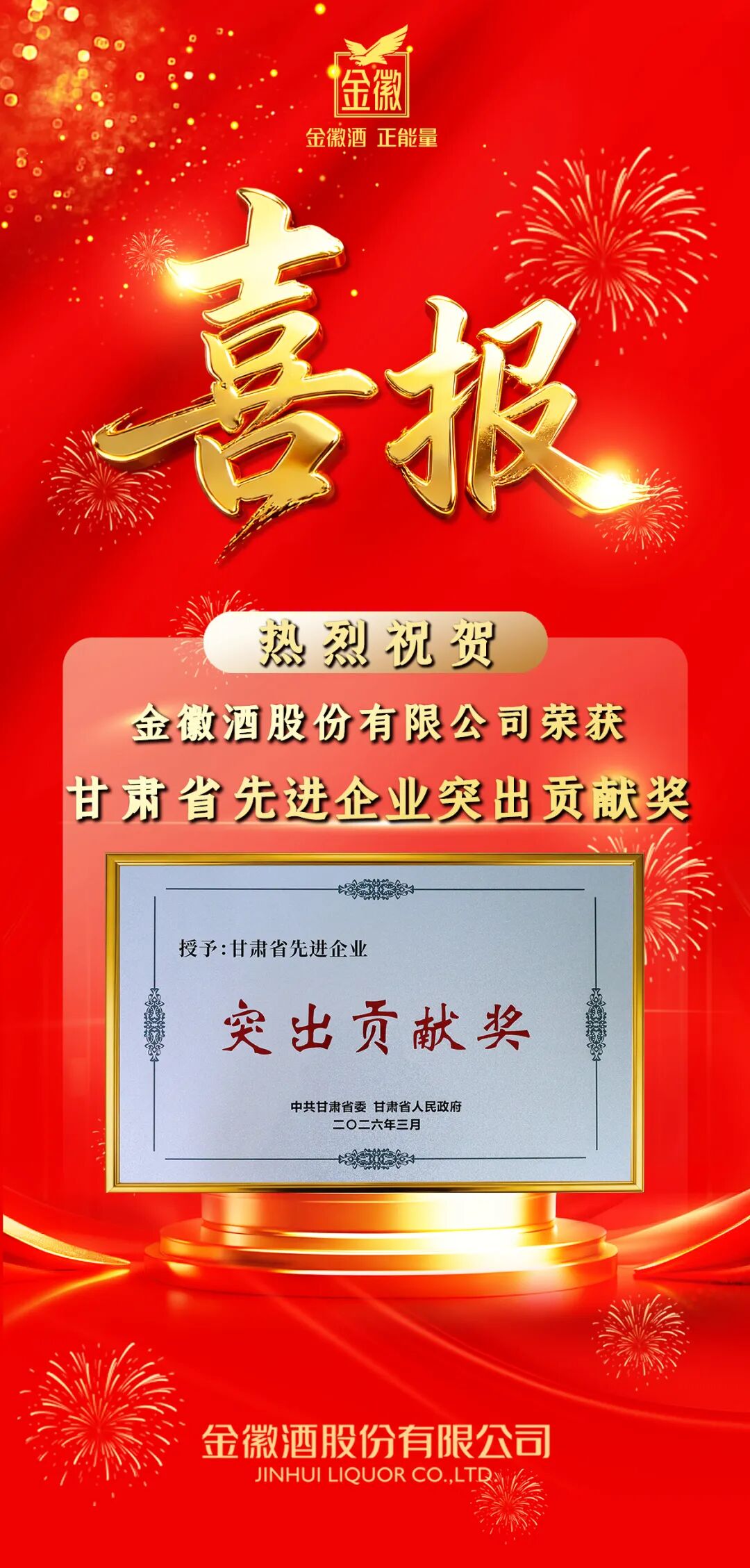 近日,在甘肃省委、省政府隆重召开的全省强工业大会上,金徽酒股份有限公司以高质量发展、科技创新、产业赋能及社会贡献等领域的突出表现,被授予“甘肃省先进企业突出贡献奖”殊荣。这一荣誉不仅是对金徽酒多年来深耕白酒主业、引领产业升级的高度认可,更是对公司作为陇酒领军企业持续赋能地方经济、推动工业高质量发展的充分肯定。