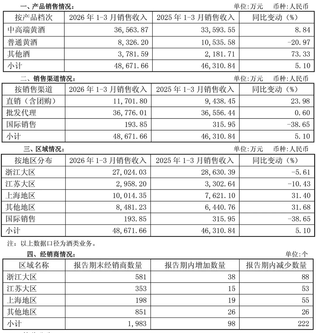 4月27日,会稽山发布公告称,公司2026年一季度实现营收5亿元,同比增长3.94%;净利润1.2亿元,同比增长27.96%(另附一季度公司经营数据)。
