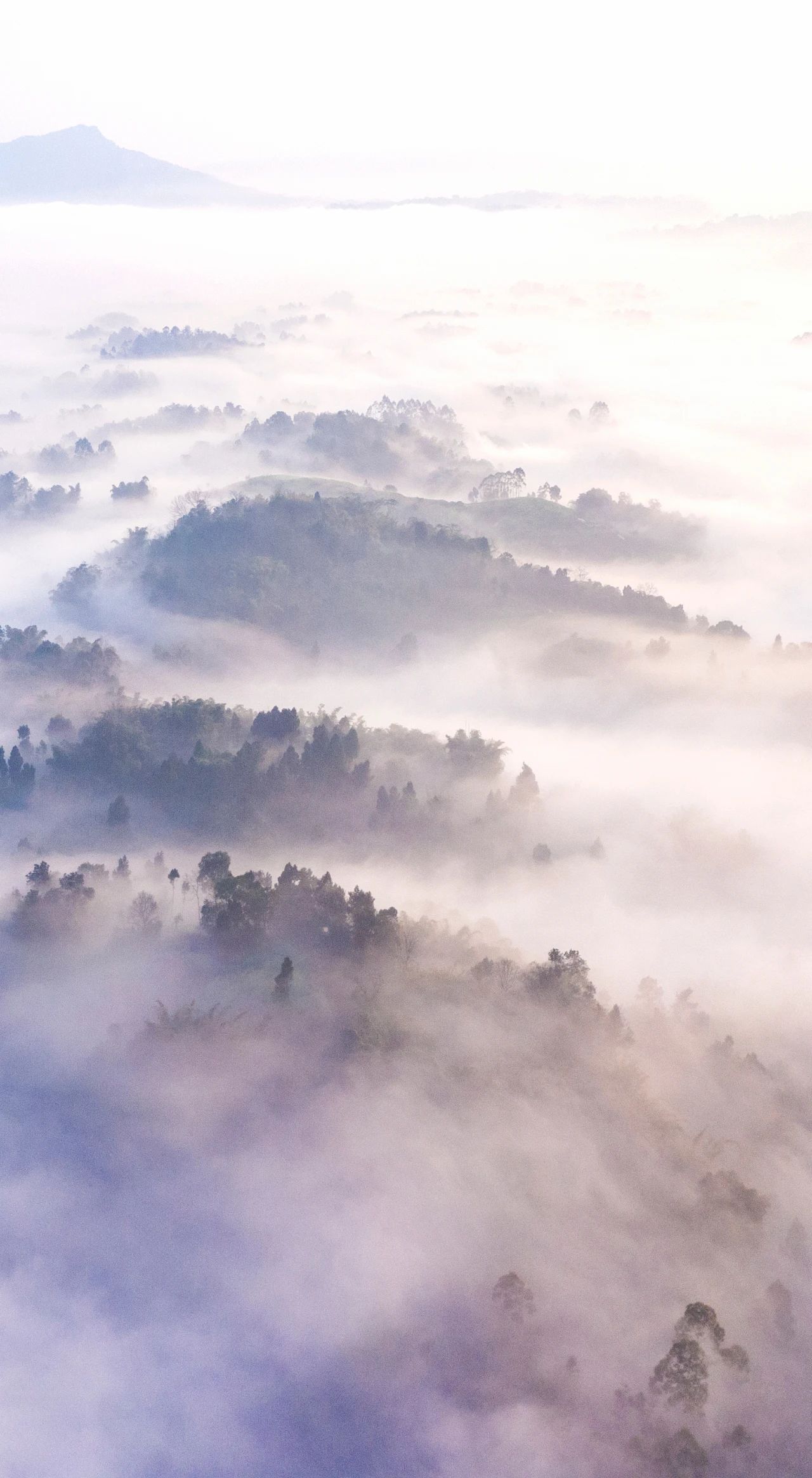天气虽冷,但地底是暖的,夜里两种气流相遇,空气就凝结成小水晶,清晨山间就披上一层缥缈烟纱。晓雾忽有还忽无,远山如近复如遥,天地变成水墨,人间如若仙境。