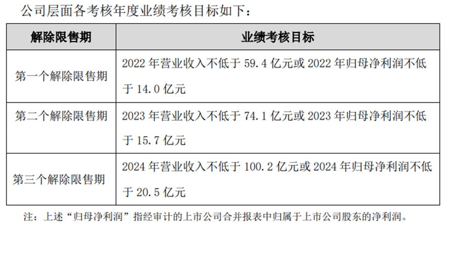 而公司层面的具体业绩考核目标分别为:2022年营业收入不低于59.4亿元,或2022年归母净利润不低于14.0亿元;2023年营业收入不低于74.1亿元,或2023年归母净利润不低于15.7亿元;2024年营业收入不低于100.2亿元,或2024年归母净利润不低于20.5亿元。