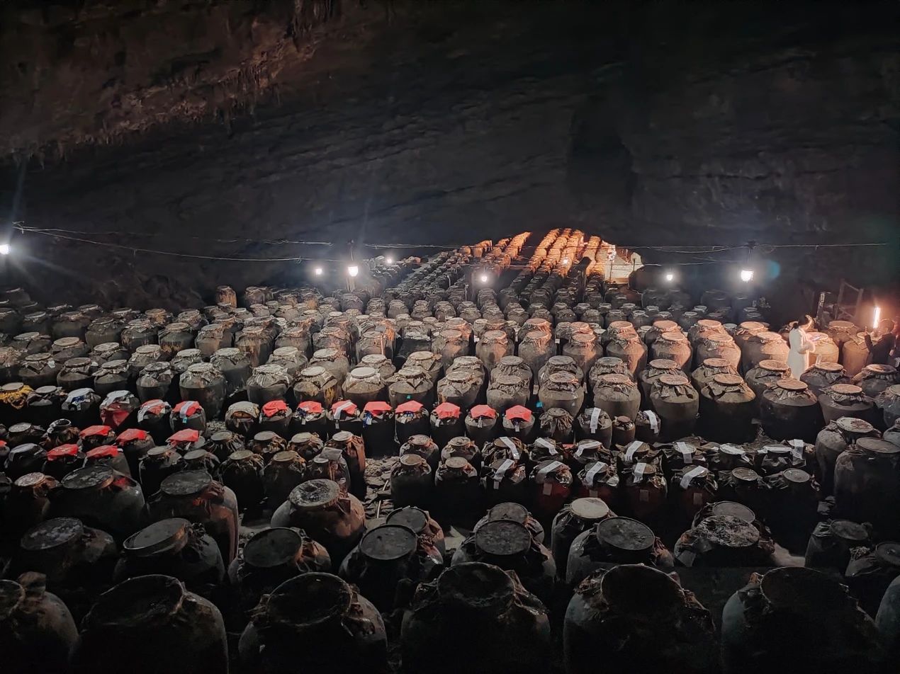 资料显示,长达亿年的喀斯特地貌,形成数万平方米的天然溶洞。这里常年保持恒温(20℃)恒湿(相对湿度78.5%)。从嘉庆年间至今,数百年酿酒历史传承,形成特有酿酒微生态。