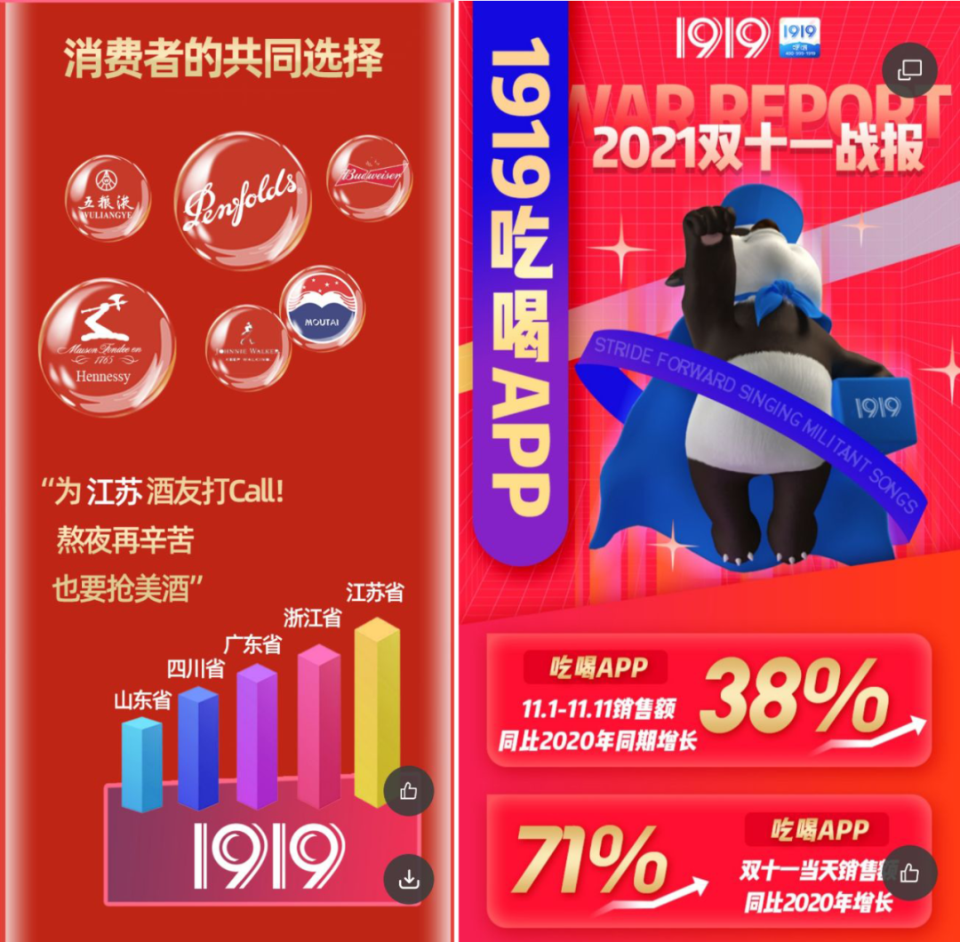 2021年双11战报落定,1919再夺三项第一。 11月11日24点,2021年双十一全球狂欢节落下帷幕,天猫成交5403亿元再创新高,1919最新战果随之出炉。 作为酒类新零售的引领者,“壹玖壹玖官方旗舰店”再次问鼎天猫双十一酒类热销店铺排行榜,并取得三项第一。在维系良好商业生态升温同时,为用户带来更好的服务体验,品牌知名度美誉度也得到极大提升。 双十一期间1919取得高光表现,背后原因何在? ❶ 勇夺三项第一 参与双十一大促多年,1919多年蝉联行业第一。今年双十一,1919拿下天猫“酒类狂欢热卖榜”榜首,白酒品类销售第一,以及双十一当天葡萄酒品类第一。 天猫酒水战报显示,双十一期间,销售额突破亿元的旗舰店只有壹玖壹玖官方旗舰店与五粮液官方旗舰店两家,其中壹玖壹玖官方旗舰店销售额突破2亿元。此外,80、90后依然是主力消费人群,81.57%的消费者的客单价在800元以上。 疫情的反复影响和都市人生活方式的改变,促使本地生活类平台销量猛增。1919美团(外卖)店同比增长286%,1919饿了么店同比增长107%。 公司自营平台1919吃喝APP的战报显示,双十一全周期销售额同比2020年增长38%,双十一当天销售额同比增长71%。 云酒头条(微信号:云酒头条)获悉,2021年双十一期间,1919天猫店洋酒类保持高速增长引领新趋势。干邑白兰地、威士忌成为消费者最爱的洋酒品类,与2020年相比增长216.71%。在葡萄酒方面,大部分消费者依然倾向于国际品牌,销量与去年同比增幅达49%,白酒、葡萄酒品类销量也位居第一。 有业内人士分析,1919在天猫白酒和葡萄酒狂欢热卖榜中跻身前三,烈性洋酒实现全面增长,公司在上述品类中的领先优势仍十分明显。三方电商平台、自营平台、线下门店在双十一期间业绩都呈上涨趋势。 ❷ 服务与体验致胜 双十一期间,商家促销手段花样繁多。1919能得到消费者追捧和认可,关键就在于真诚服务,体验致胜。 有消费者表示,双11期间1919从顾客的角度出发,不搞复杂的优惠政策和让利噱头。在100%品质保障的同时,做到价格实在、有优势,服务体验进一步升级。 一方面,是“货真价实”的优惠体验,酒品保真又价格超值。1919每一瓶酒都能做到保真,产品溯源系统让每瓶酒从出厂到开瓶消费,全程可查。1919在天猫、京东、美团、拼多多等平台官旗也设置了多重花式福利,“让消费者一次囤个够”。 另一方面,1919发力“即时零售”,让消费者下单后最短时间就可以收到酒品,享受到了“即时购酒,即时享受”的良好体验。 除了销售数据的亮眼,1919的配送服务也再次刷新了记录,1919天猫店首单配送时间仅为2分钟;1919吃喝APP首单完成时,距离消费者下单仅用时1分18秒,比2020年提前了1分51秒。“分钟级”的履约服务进一步升级。 作为首批开展极速配送服务的品牌,1919的“快”是其核心竞争力之一。2021年双十一期间,1919在配合防疫政策的同时,延长门店销售时间,门店做为前置仓和履约服务站,根据LBS定位由附近门店发货,最快19分钟内送达,为消费者带来了全新的购酒体验。 多位1919合作伙伴表示,2021年公司双十一再次夺冠,并发力即时零售、直播带货等多条赛道,公司整体实力和综合优势愈发凸显。同时,1919开展优质的服务及消费体验,让用户得以长期留存,借此与消费者建立起品牌信任和黏性。 ❸ 线上线下同步扩张 在“双十一”大战中,1919从货到人、从服务到体验,都体现出强大的实力。而公司电商业务的高速增长和线下门店的稳步扩张,成为公司打造酒业新零售龙头的关键。 双十一期间,1919除全国700多家直营店外,还有千余家直供店也参与其中,LBS定位超过800个城市。 据悉,2021年以来,1919直供店正不断覆盖更多三至五线城市。离下沉市场越近,离消费场景越近,越了解用户的需求,1919将持续为用户提供更优质有温度的服务。 ▲1919吃喝APP双十一直供店销售TOP5(左);1919美团外卖&饿了么双十一直供店销售TOP5(右) 同时,作为酒业新零售实践者和引领者,1919加速打破线上线下区隔,不仅给C端用户带来了更好的需求满足,也为B端传统酒企酒商转型提供了机会。1919 的会员系统和供应商管理系统,能够同时满足B端和C端的需求并与之互动,帮助实现产品开瓶动销。 通过双十一可以看到,1919线上电商下单与线下门店送货相互配合,形成了良好的协同效应。这个侧面来看,1919已经整体完成调整,并呈现出强劲且持续的发展势头。 如果将每年一度的双十一比喻为酒业一次大考,1919此次再度取得高分,是公司坚持品质第一和产品溯源,利用门店数量和互联网优势为合作伙伴赋能,以及做好服务和体验发力即时零售的结果。这也标志着1919在企业组织建设、团队培养、线上线下融合、营销落地、履约服务等方面都跃上新高度,公司实现百亿目标的基础愈发牢固。