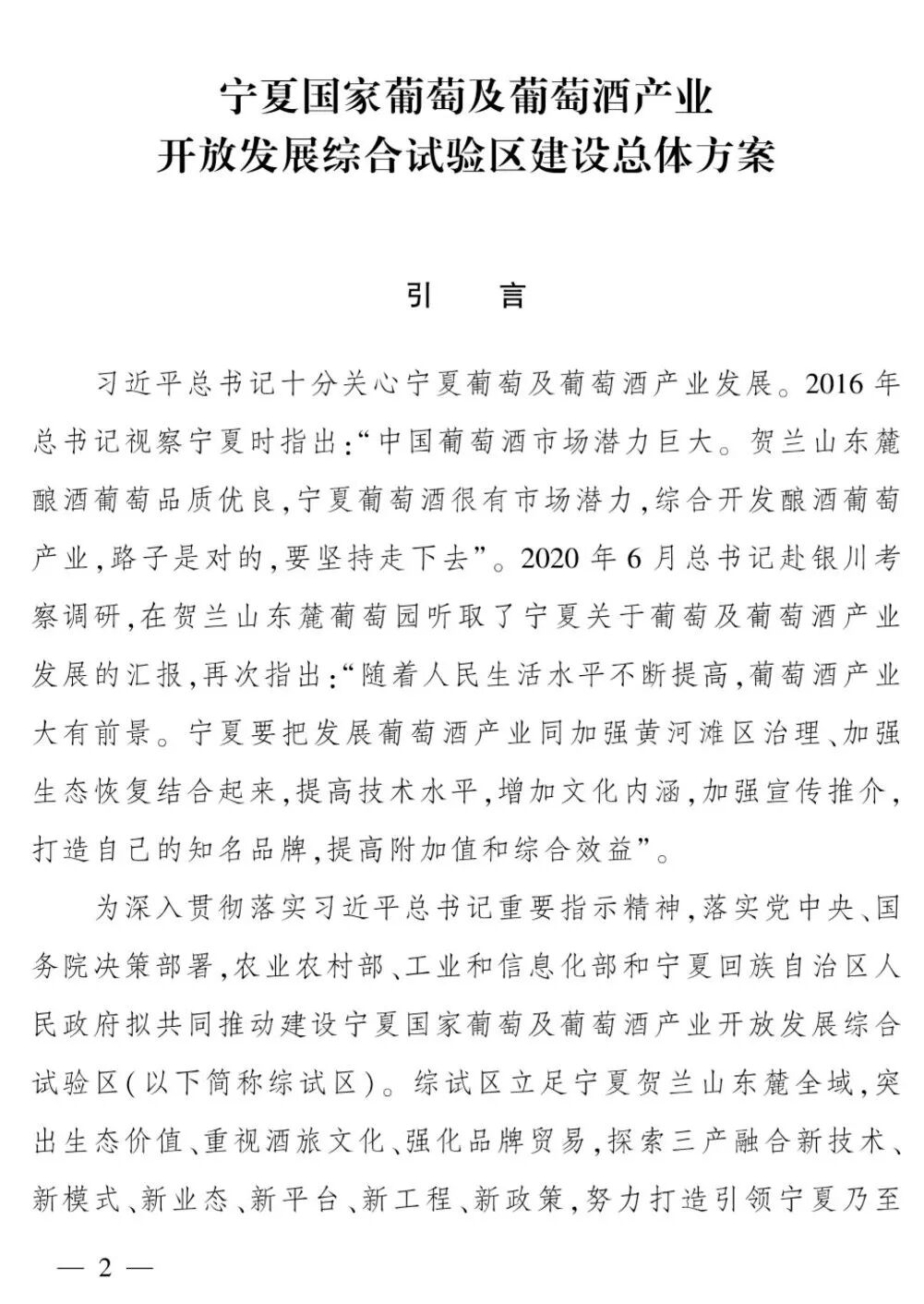 云酒头条(微信号:云酒头条)获悉,5月25日,农业农村部、工业和信息化部、宁夏回族自治区人民政府联合印发《宁夏葡萄及葡萄酒产业开放发展综合试验区建设总体方案》。 《方案》明确,力争到2025年,贺兰山东麓酿酒葡萄基地总规模力争达到100万亩,年产葡萄酒3亿瓶以上、实现综合产值1000亿元左右;力争到2035年,贺兰山东麓酿酒葡萄基地总规模力争突破150万亩,年产葡萄酒6亿瓶以上,实现综合产值2000亿元左右。 把贺兰山东麓建成全国优质酿酒葡萄种植、繁育基地,产品远销共建“一带一路”国家的中髙端酒庄酒生产基地,辐射全球的葡萄酒品牌交流、科技合作、文化传播、生态示范基地,打造中国葡萄酒全方位融入世界的窗口、农业特色产业深度开放发展的高地、“一品一业”促进乡村振兴的样板。 至2025年,宁夏将建立健全覆盖种植、酿造、销售全过程的质量安全追溯体系,推进葡萄酒产业与专业教育、文化旅游、康养休闲、生态富民等产业的全面融合,探索形成一批绿色生产、智慧化管控、利益联结的产业发展新模式,经济、社会、文化、生态效益进一步显现,农民群众在试验示范中得到实惠,获得感明显增强。 至2035年,综试区在对外开放、创新融合、绿色生态方面均取得重要成果,现代葡萄与葡萄酒产业、生产、经营三大体系全面建成,一二三产业高度融合,宁夏葡萄与葡萄酒对外开放发展格局全面形成,生态可持续发展体系健全完善,区域经济发展协调统一,基本达到中国葡萄酒现代化发展阶段。 根据方案,综试区涵盖贺兰山东麓葡萄酒国家地理标志产品保护区,并划分为核心区和辐射区。核心区规划面积108平方公里,包括2个片区:银川市永宁县闽宁片区94平方公里和贺兰县金山片区14平方公里。辐射区规划面积394.2平方公里,包括4个片区:银川市西夏区镇北堡片区144.74平方公里,吴忠市青铜峡市鸽子山片区176.09平方公里、红寺堡区肖家窑片区40.02平方公里、同心县罗山东麓片区33.35平方公里。综试区范围不在自然保护区等各类生态保护红线内。 以下为《方案》全文。