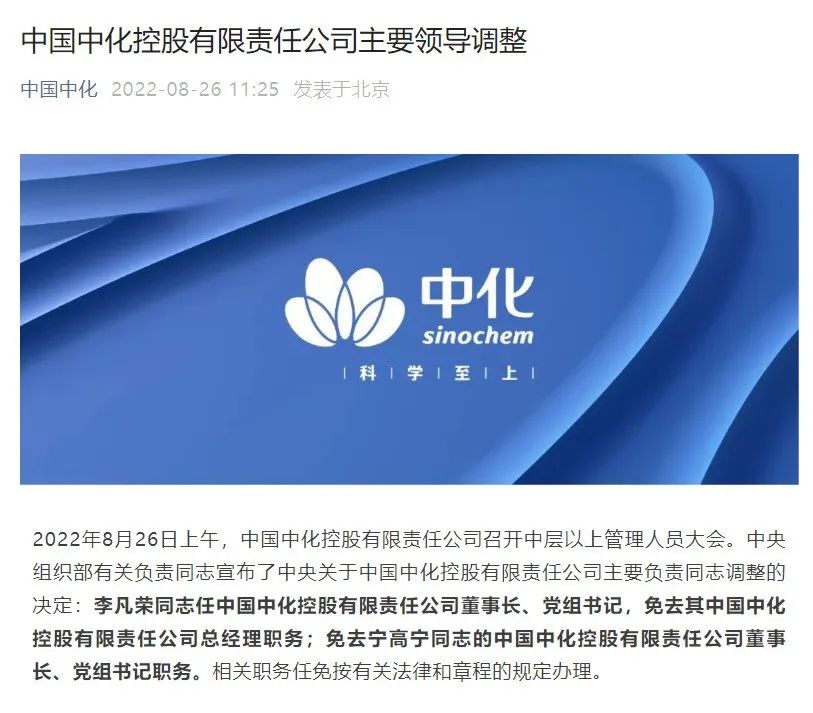 8月26日上午11点25分,中国中化官微推文,免去宁高宁同志中国中化控股有限责任公司董事长、党组书记职务,李凡荣接任。