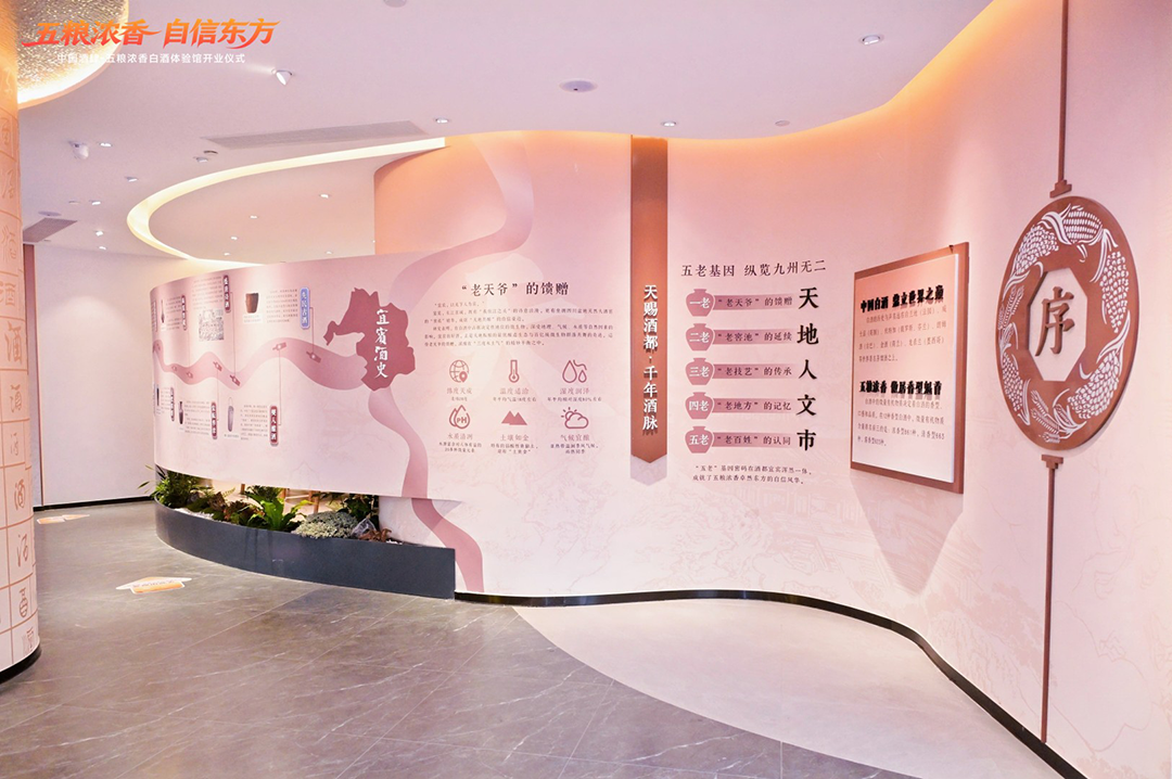 步入馆内,墙上的“五老基因(老天爷的馈赠、老窖池的延续、老技艺的传承、老地方的记忆、老百姓的认同)”是五粮浓香文化与产品品质的核心密码。