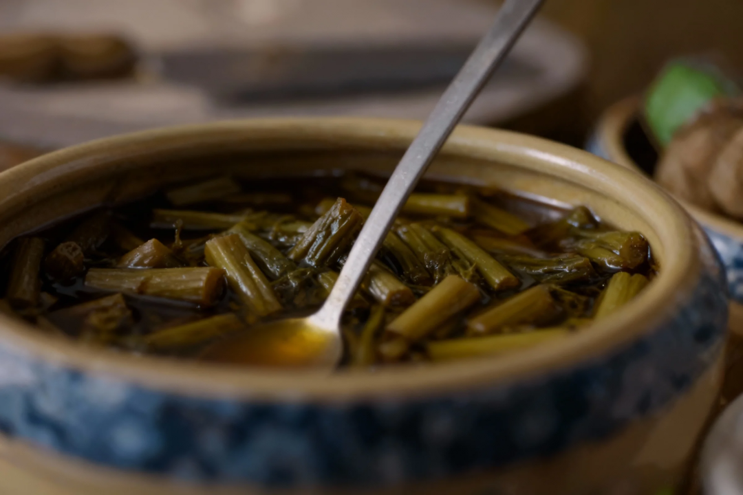 但想做好却不容易。手法之外,“老卤”是霉苋菜梗的灵魂。就像白酒的老窖池一样,老卤有着更稳定的微生物菌群,等来年再做,会起到引子的作用,发酵效率更高、菜的口味也更好。