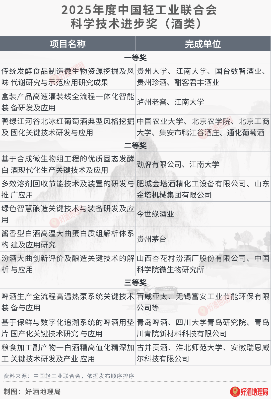 3月19日,中国轻工业联合会发布关于2025年度中国轻工业联合会科学技术奖励的决定。其中3个酒类项目获2025年度中国轻工业联合会科学技术进步奖一等奖、5个酒类项目获二等奖、3个酒类项目获三等奖。具体如下图。(中国轻工)