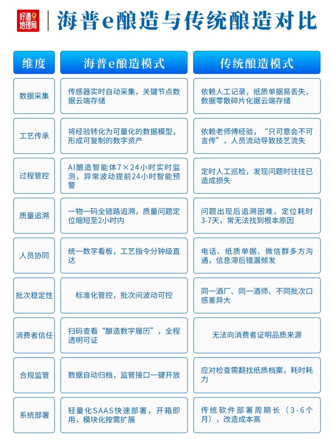 海普给出的答案,是一套数字化的酿造体系。它不试图取代人,而是把老师傅的手艺变成数据、变成模型、变成可以复制和进化的数字资产。