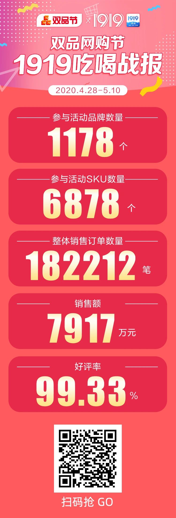 5月10日,由商务部、工业和信息化部、国家邮政局与中国消费者协会共同主办的第二届“双品网购节”正式落下帷幕。 这是一次政府搭台、企业唱戏,共同推动消费需求回升的活动。1919因“餐+酒”业务而受到主办方认可并受邀参与本届购物节,还承担了重要的角色。 据1919工作人员透露,本届双品网购节,共有1178个品牌、6878个SKU通过1919平台实现引流,整体销售订单数量达182212笔,实现销售额达7917万元,好评率为99.33%。对于行业而言,上述这些成绩,以及1919参与此次购物节还意味着什么? ❶ 政府组织,名企联动,这场购物节不止“买买买” 本次活动从4月28日启动,至5月10日落幕,共计13天。不同于普通的网购活动,双品网购节是由商务部等多家政府组织共同举办,社会效益更加凸显,参与企业遴选也更为严格。 数据显示,2019年首届“双品网购节”期间,共有超过10万个品牌参与,商品总体好评率超过97%,销售额达770亿元人民币,带动同期全国实物商品网络零售额达2850亿元,同比增长28%。 今年的第二届双品网购节,仅参与其中的电商企业便超过百家,是首届的10倍,政企双方对本届购物节也更为重视。为贯彻落实相关政策,4月29日,四川省商务厅曾组织召开“双品网购节”资源对接会,五粮液、泸州老窖、剑南春、郎酒等省内白酒企业和老房子餐饮、麻辣空间、蓉城老妈等餐饮企业均参加此次会议。 据悉,此次对接会旨在鼓励四川餐饮企业和川酒企业,通过1919线上平台推出一系列餐酒组合套餐,完成引流,带动实体消费,从而实现深度融合、资源互补。从数据来看,本次双品网购节共有1178个品牌、6878个SKU与1919合作,足见企业对1919平台的认可度。 ❷ 与双品网购节合作,为什么是1919 是什么促成了1919与双品网购节合作? 首先,是四川省政府以龙头企业为发力点,借助三大平台促进全行业的发展的规划。本次双品网购节,四川省遴选出1919、四川文轩和四川长虹三家企业参加。从企业在各自行业内的地位来看,1919是中国最大的酒类平台运营商;四川文轩在线年图书销售规模稳居新华书店电商第一;四川长虹是中国构建消费类电子技术创新平台的代表型企业,皆是各自行业内的头部企业。 其次,1919“餐+酒”模式与活动契合度极高。川菜和川酒是四川的两张名片,四川省商务厅负责人曾表示,要着力把握好互联网发展新业态、新模式,在业态创新的基础上促进两者的在线融合。行业人士分析,此次双品网购节,政府有关部门推动白酒企业与餐饮企业的深度融合和资源互补,选择1919,正是认同了1919在餐酒结合方面的运作能力。 最后,对于1919而言,这是一次充分展示平台实力的契机。据悉,活动期间,1919利用吃喝APP与1919丹露两个平台,通过推出爆品套餐秒杀、代金券秒杀、名酒特价秒杀、地区特产秒杀等促销方式促进消费。活动期内,1919平台共拿下182212笔订单,实现销售额7917万元。 业内认为,作为线上线下一体化的酒类流通平台,1919已凭借自身优势,在本次购物节中脱颖而出。 ❸ 融合更多资源,1919“餐+酒”引领消费新场景 获得官方认可,“餐+酒”业务模式背后,是1919怎样的布局? 早前,1919将快喝APP更名为吃喝APP后,宣布推进餐酒融合。今年2月,1919与盒马鲜生联手抗疫,云酒头条(微信号:云酒头条)曾预测,1919正以抗击疫情作为契机,开始从单纯的酒类平台上向综合类平台转型,通过平台创造一个以酒饮消费为核心的消费场景,从单一酒类延伸到生鲜饮食,在此基础上形成全新的、更顺应市场发展的酒类零售终端。 事实也是如此,从2月18日起,1919先后与香天下、香爱、香遇、香守、成都宴等著名品牌合作,推出火锅外送服务。据1919工作人员介绍,至4月中旬,1919全国签约品牌约600多家,累计订单6351单,实现销售收入170多万元。 经过前期探索和实践,此次参与双品网购节,是1919在政府有关部门的支持和鼓励下,对“餐+饮”模式展开的进一步升级。目前,1919已与四川等地区的数十家著名餐饮企业和白酒品牌建立紧密联系,将从资金、产品和服务三个层面合作,打造“美酒+美食+服务”的闭环式吃喝模式。 提及1919,业内人士总是以“新”字来形容。疫情带来的诸多变化将有长远影响,且已经影响到消费者的消费习惯,并带来消费场景的转变,酒企需要用更新的思维和渠道与消费者形成互动,“餐+酒”模式越来越成熟的1919借力点之一。