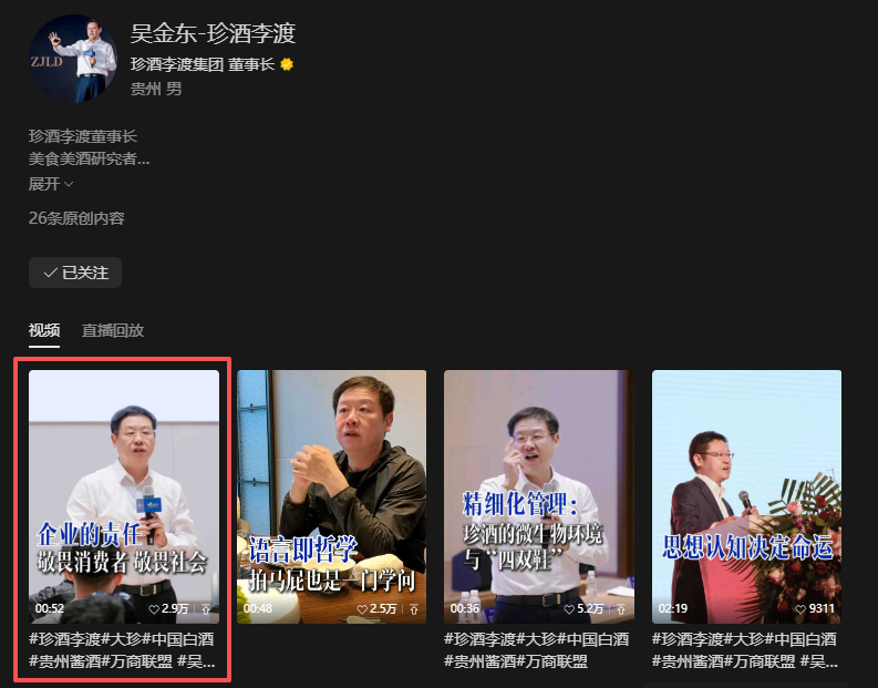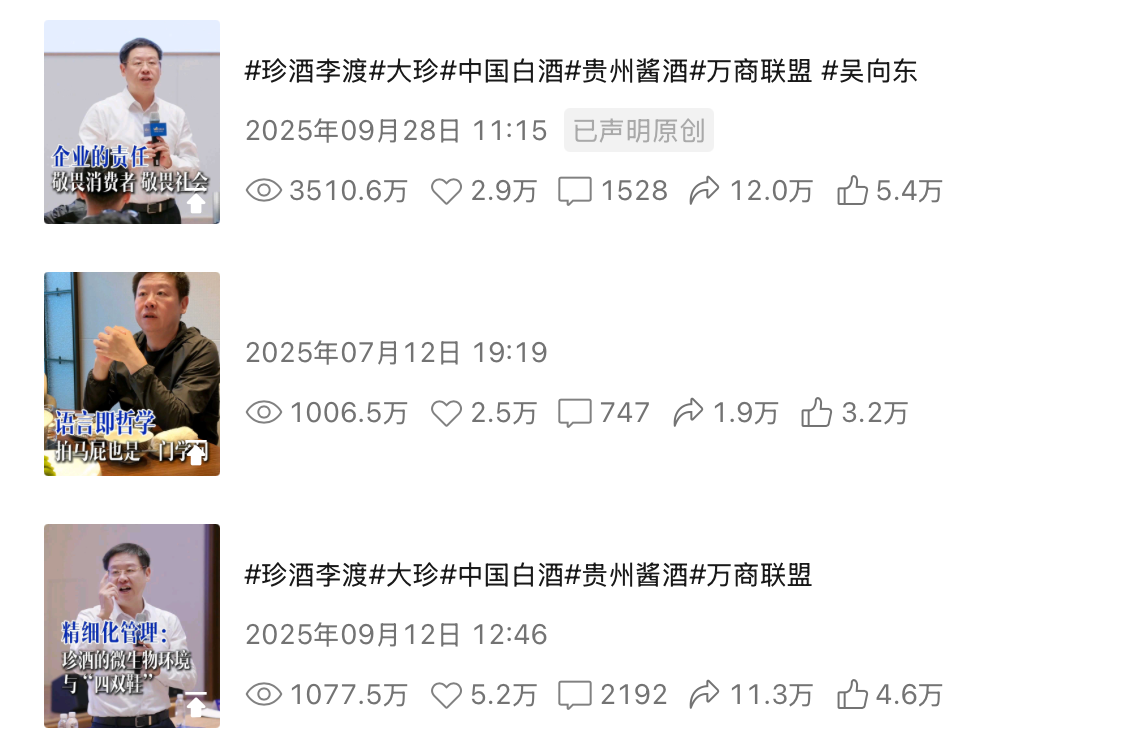 珍酒李渡集团董事长吴向东个人视频号9月底发布的一条短视频,播放量已突破3500万。