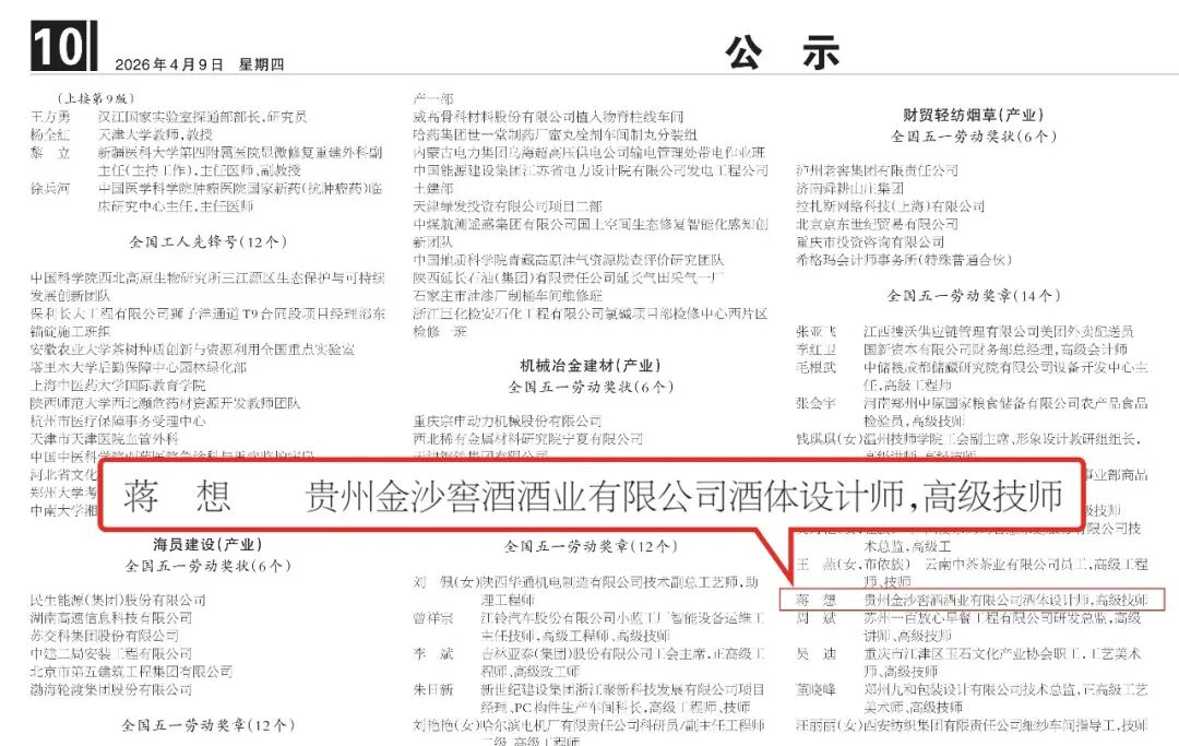 4月29日,中华全国总工会公布2026年全国五一劳动奖表彰名单,贵州金沙窖酒酒业有限公司酒体设计师、高级技师蒋想荣获全国五一劳动奖章。