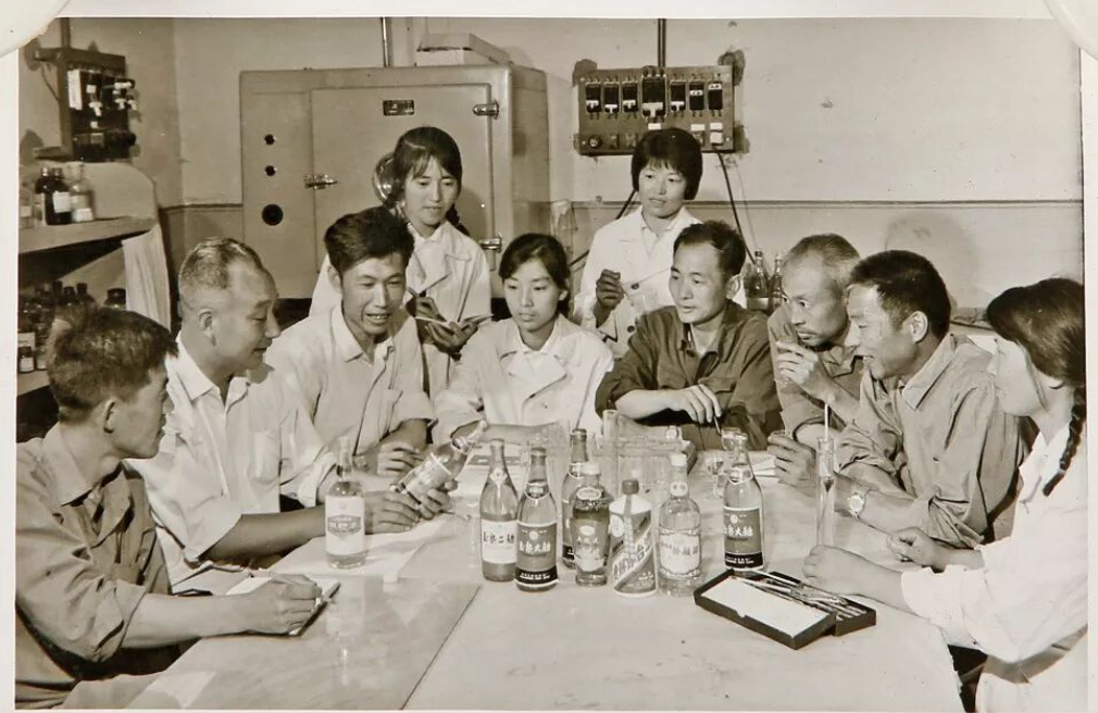 1973年~1975年,白酒专家周恒刚、高月明带领专家小组在玉泉试点,图为高月明(左三)主持玉泉试点技术研讨会。图源@玉泉酒业