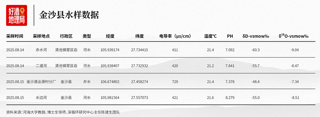 陈建生及其团队长期研究发现,赤水河上游接受青藏高原冰川融水的深循环补给,水中富含锶、硫及稀土元素,可以激活微生物酶、促进风味物质合成,成就金沙县产区酱香白酒独特的“醇柔”特色。