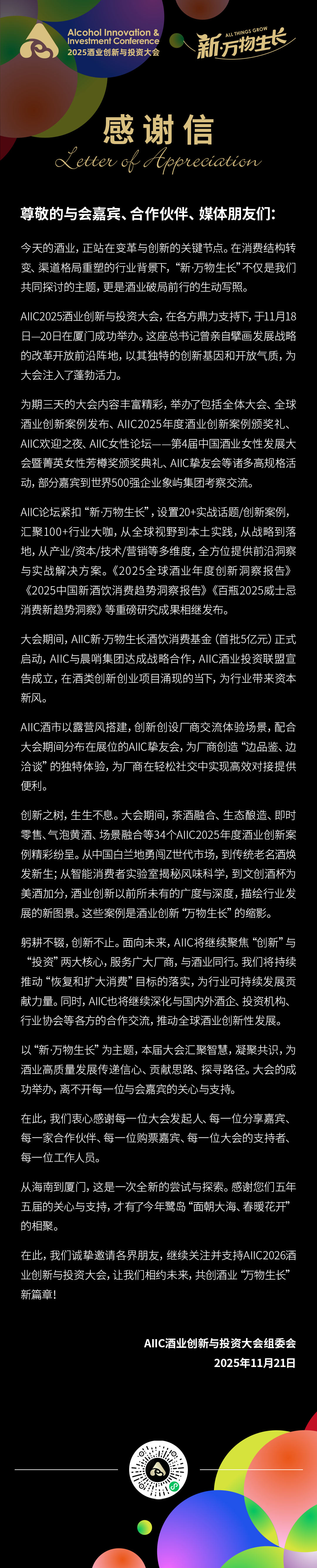 一封来自AIIC2025酒业创新与投资大会的感谢信